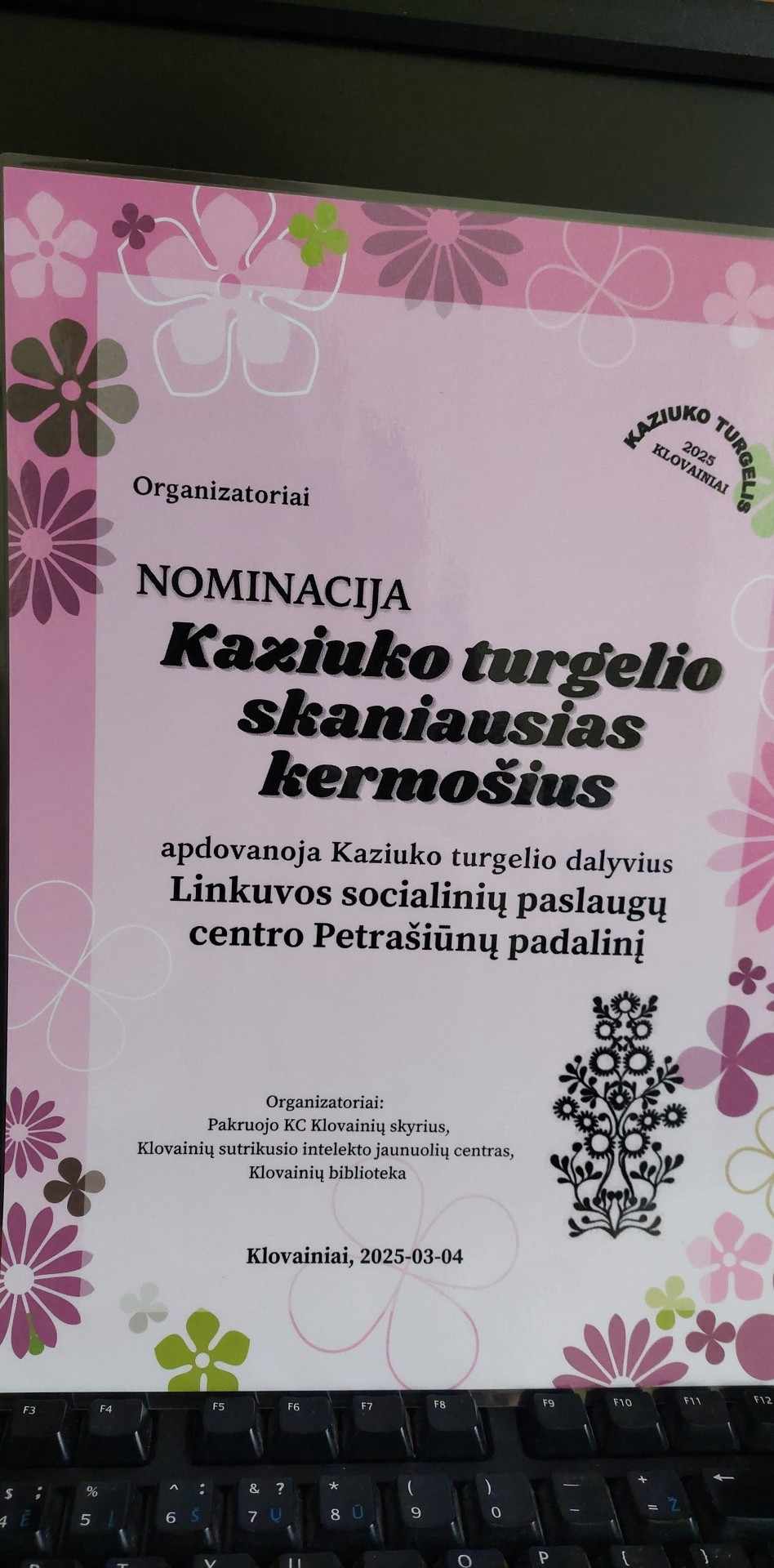 2025 m. kovo 4 d. Klovainiuose vykusioje Kaziuko mugėje Krizių centro paslaugų gavėjai su dideliu džiaugsmu pristatė savo rankomis pagamintus gaminius. Unikaliais raštais ir spalvomis megztos kojinės, rankšluostukai, pirkinių krepšiai traukė praeivių akį, o įvairiais skoniais pagardintų šviežiai iškeptų pyragaičių, sausainių ir kitų skanėstų kvapas viliojo mugės lankytojus. Paslaugų gavėjų pastangos buvo įvertintos ne tik dideliu lankytojų dėmesiu, bet ir nominacija „Kaziuko turgelio skaniausias kermošius“. Ši nominacija tapo ne tik apdovanojimu už jų sunkų darbą, bet ir bendrystės, pasitikėjimo ir atkaklumo simboliu.