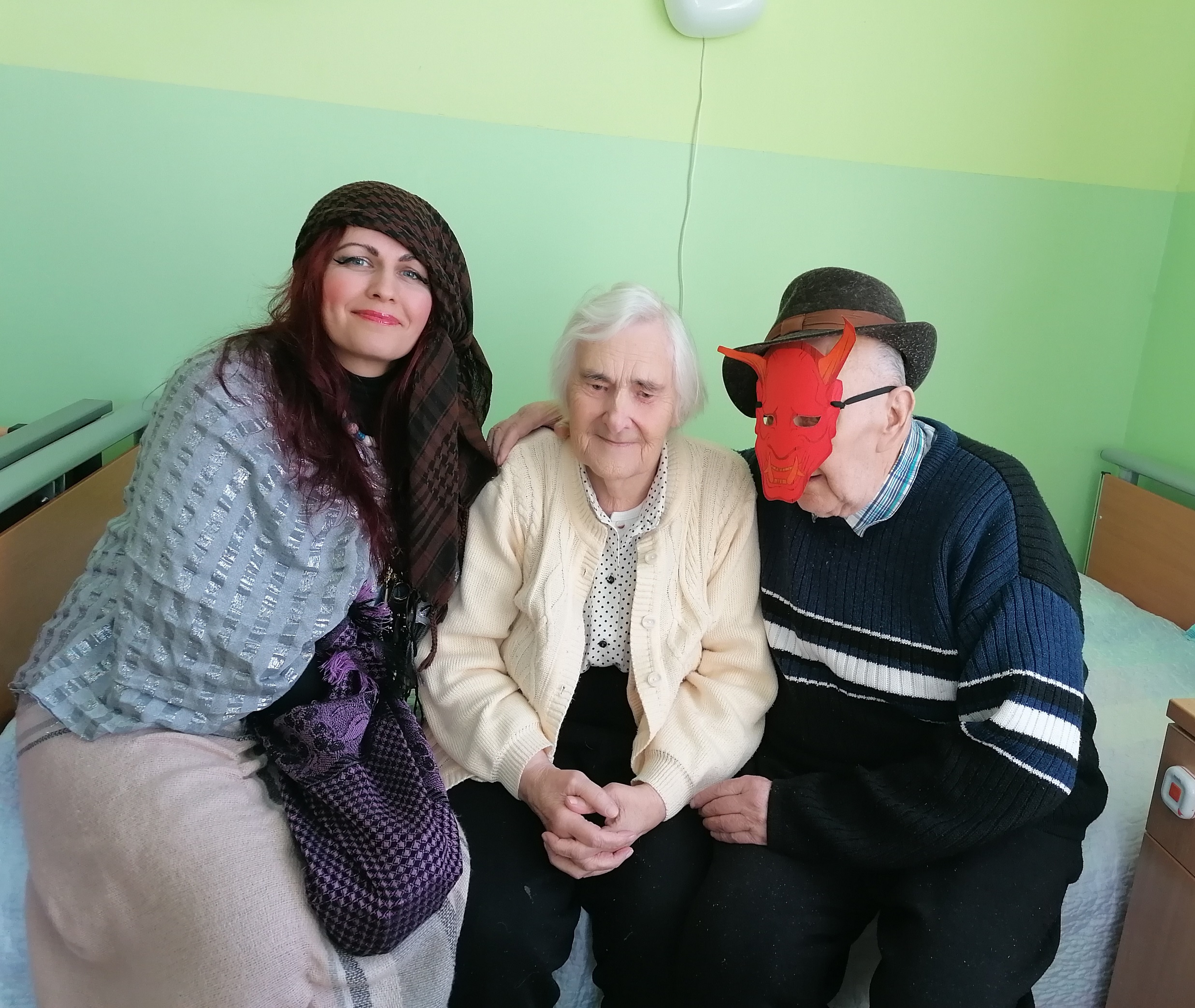 Centro gyventojai buvo maloniai nustebinti čigonės šmaikštumu, po kurios kauke slėpėsi socialinė darbuotoja Vilma ir Velniuku, kurio personažą kūrė gyventojas Algis. Sukosi čigonėlė po kambarius, laimę ir sveikatą žadėdama, būrė daug gražių dienų ir net būsimų vestuvių ateityje matė, o Velniukas skaniais blynais visus pavaišino.